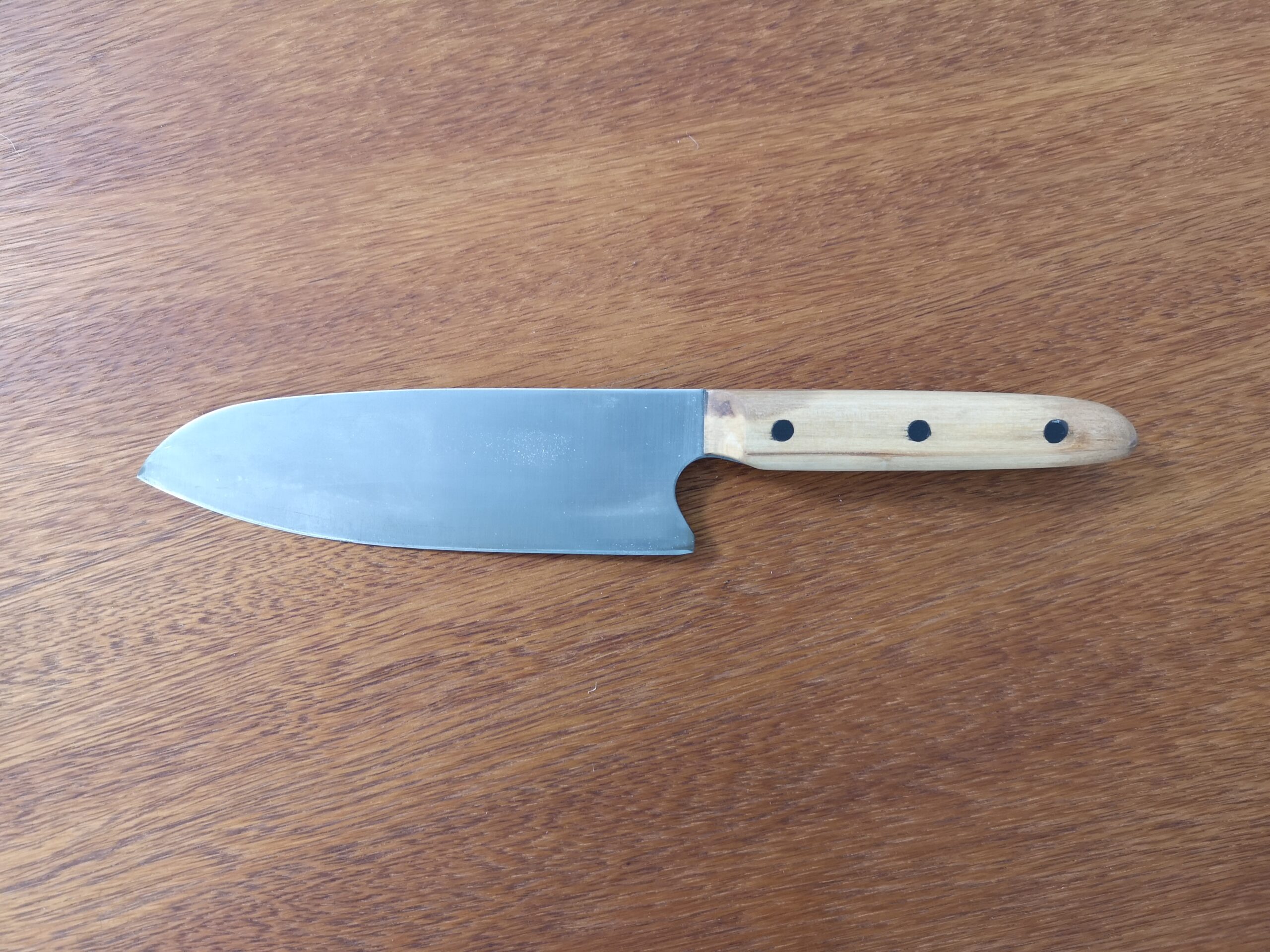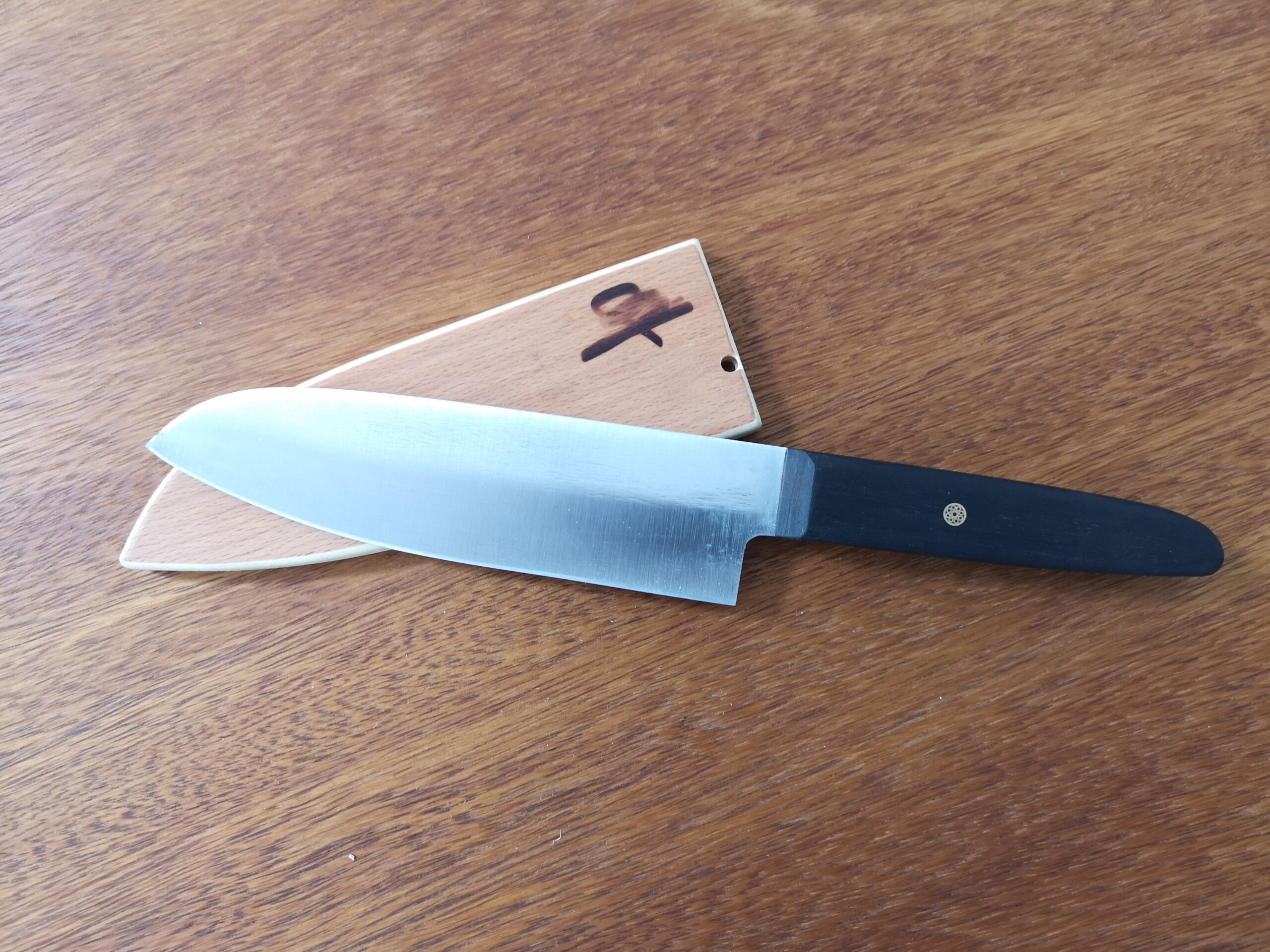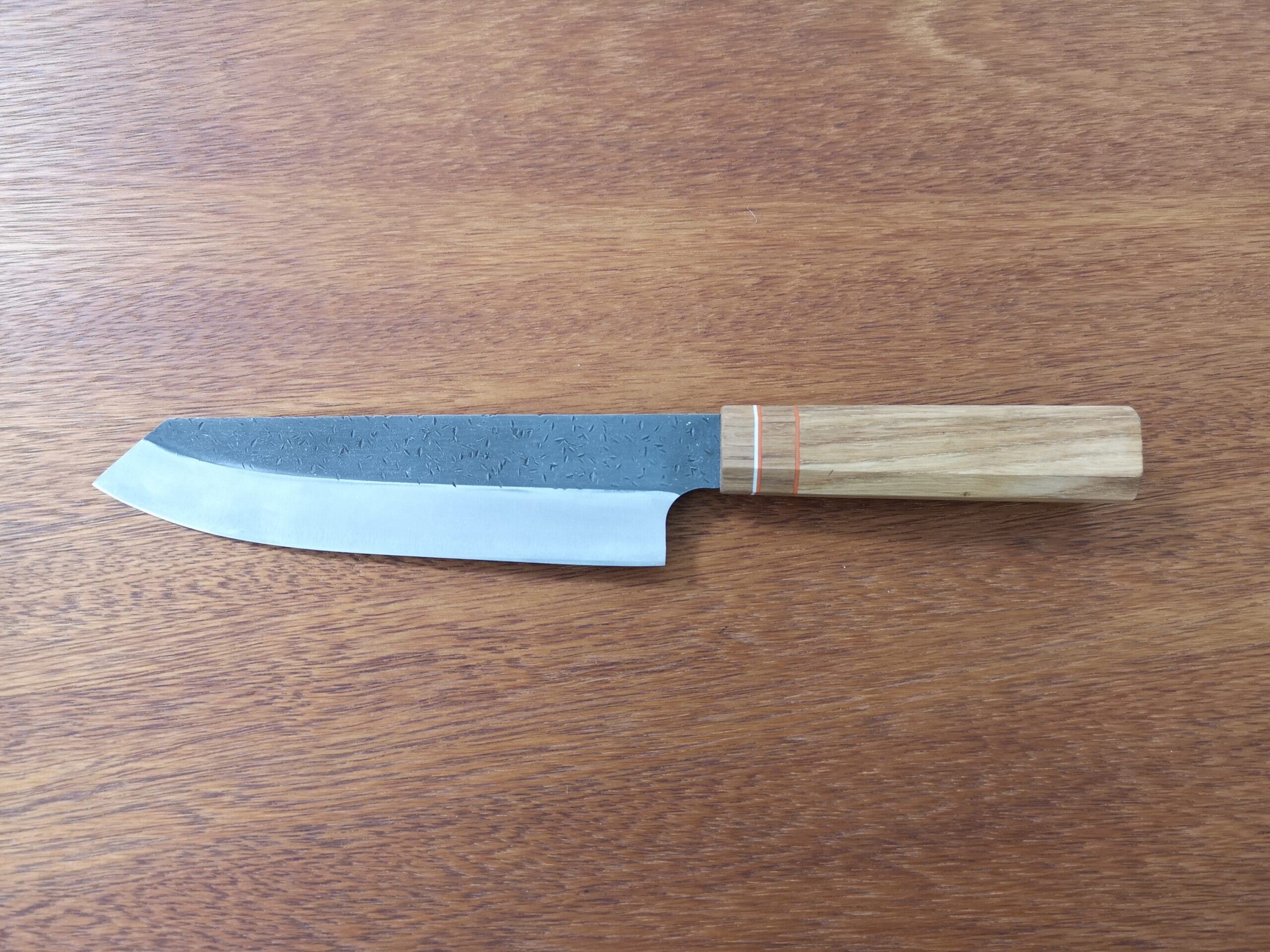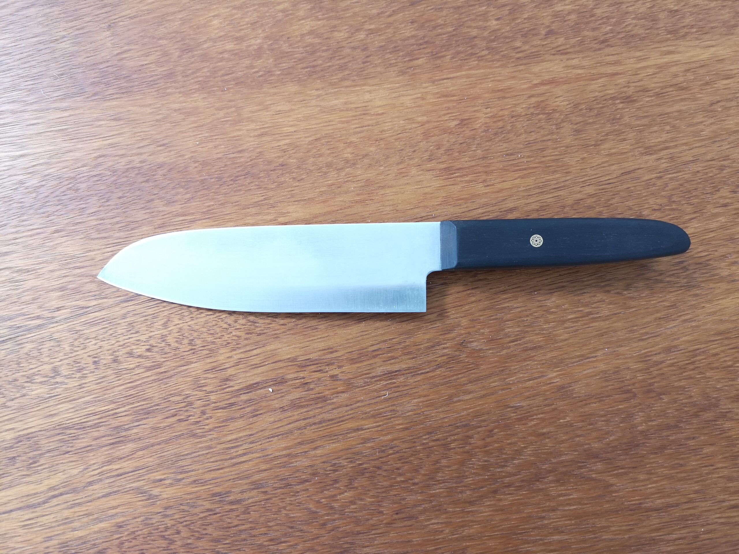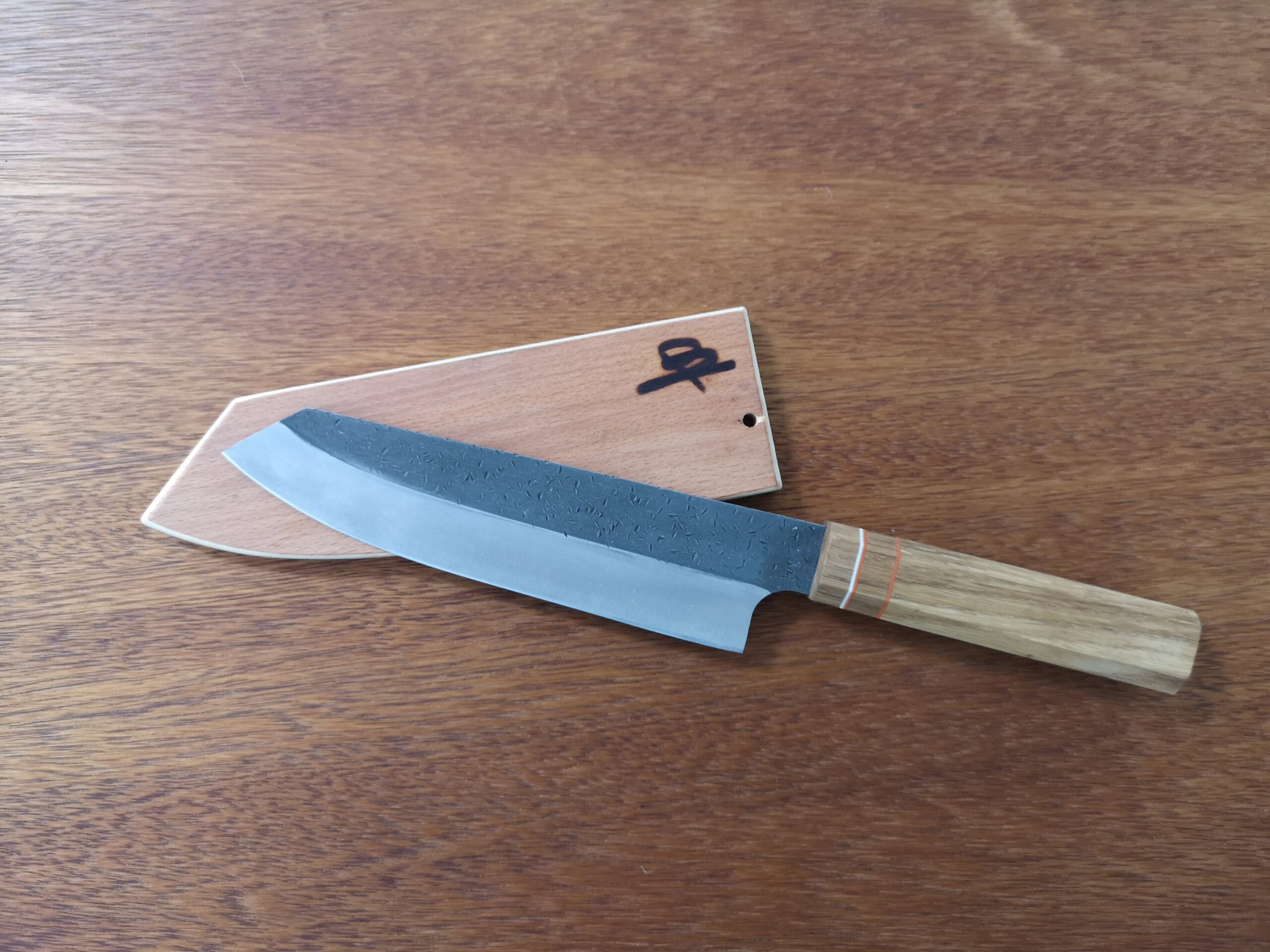 Japanischer San Mai(3 Lagen) mit Shiro2 Mittellage nicht Rostfrei Mittellage sehr hohe Schärfe und Härte plus erhöhte Zähigkeit gegenüber Shirogami(Weißpapierstahl) durch die Nickel Zugabe. Aussenseiten deutlich weicher als die Mittellage. Made in Japan Carbon: 1.0% Chrom: 0.3% Nickel: 1.0% ca.62 HR