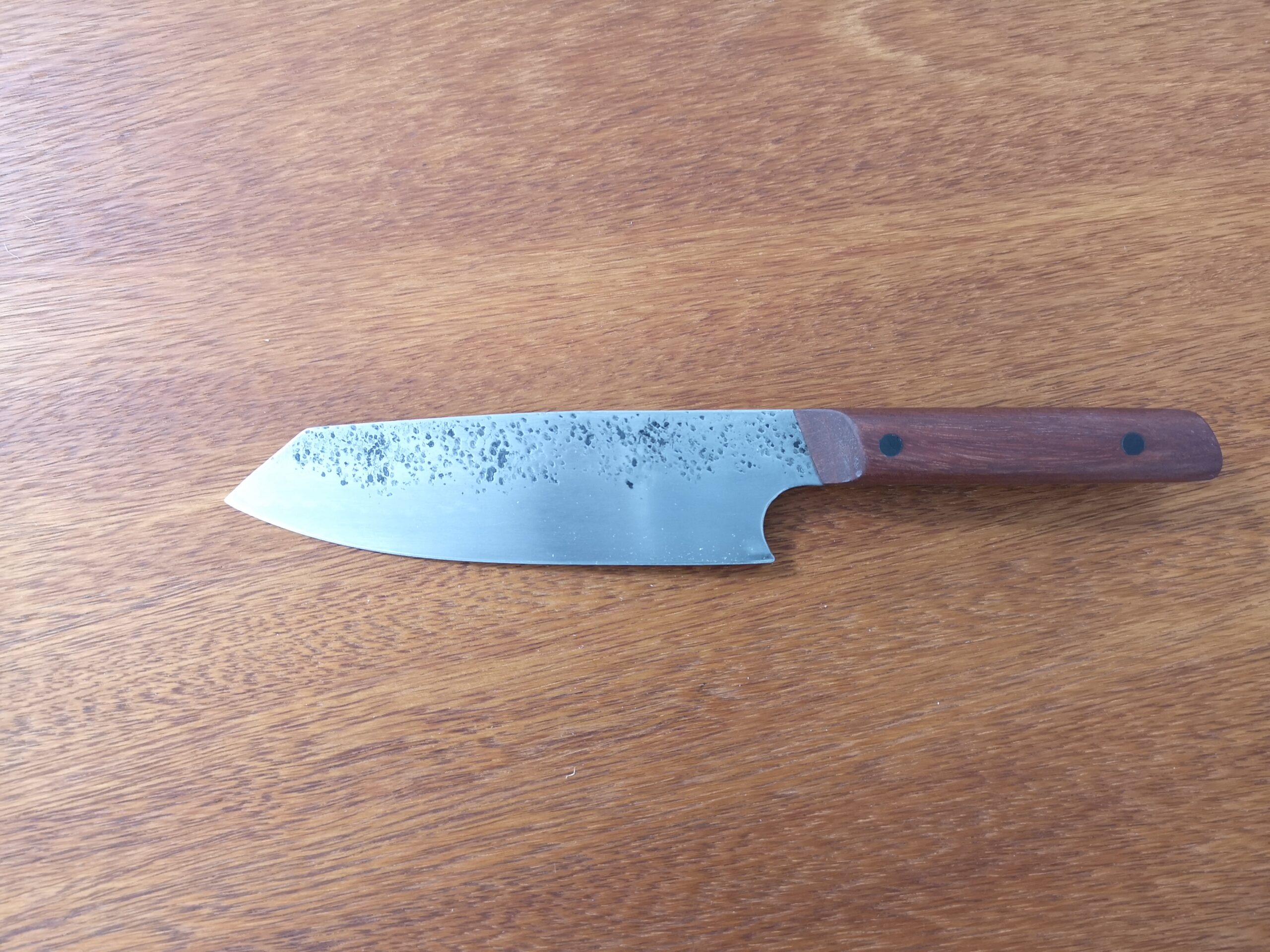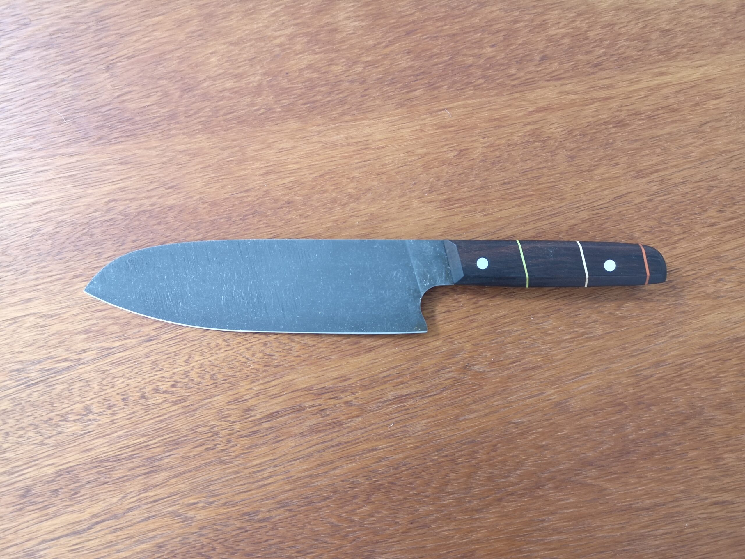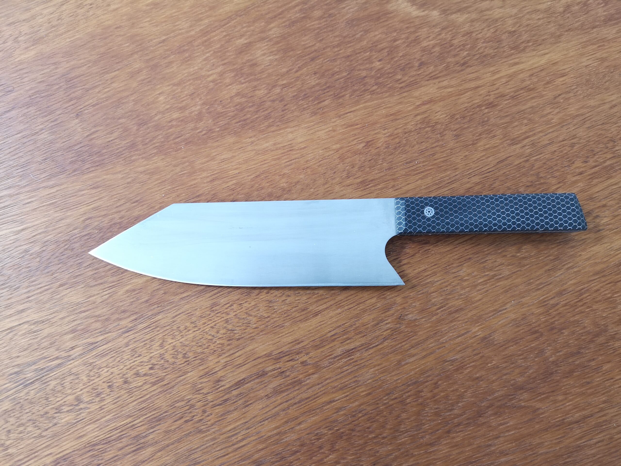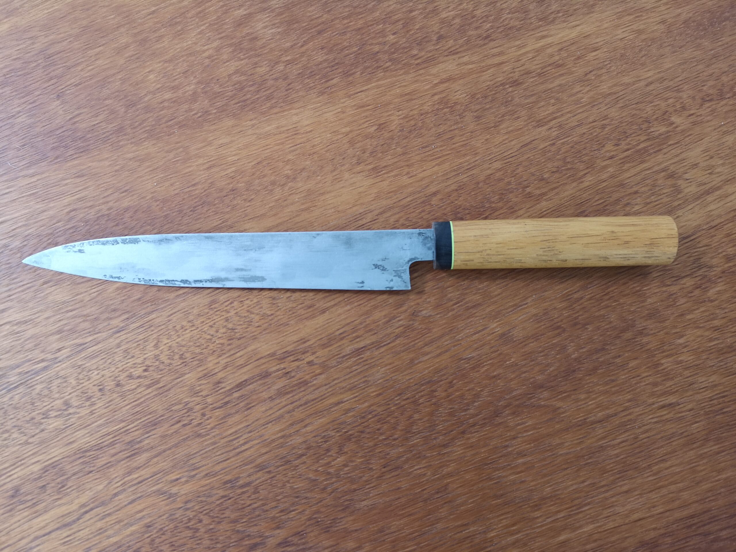 Japanischer San Mai(3 Lagen) mit Shiro2 Mittellage nicht Rostfrei Mittellage sehr hohe Schärfe und Härte plus erhöhte Zähigkeit gegenüber Shirogami(Weißpapierstahl) durch die Nickel Zugabe. Aussenseiten deutlich weicher als die Mittellage. Made in Japan Carbon: 1.0% Chrom: 0.3% Nickel: 1.0% ca.62 HR