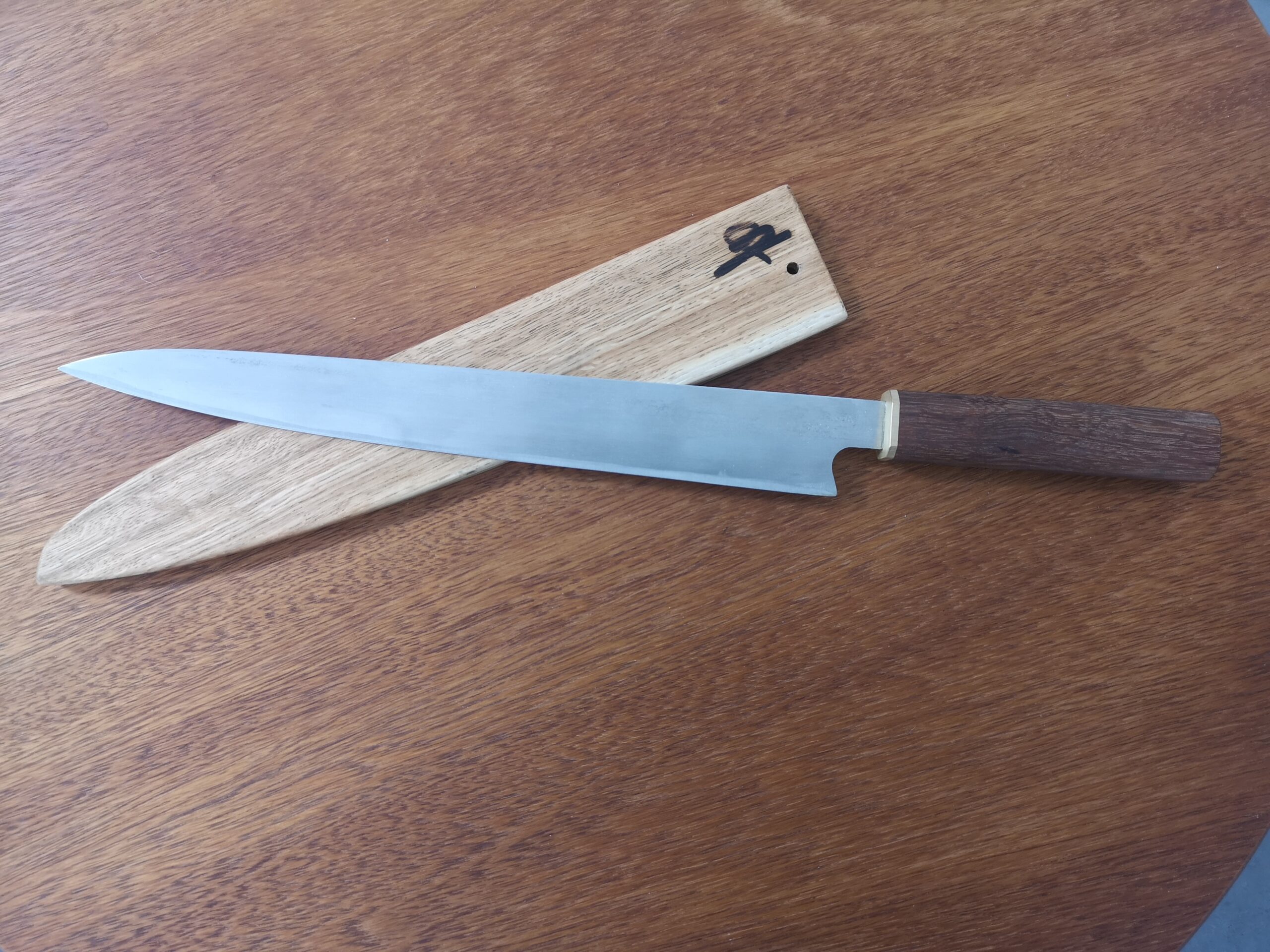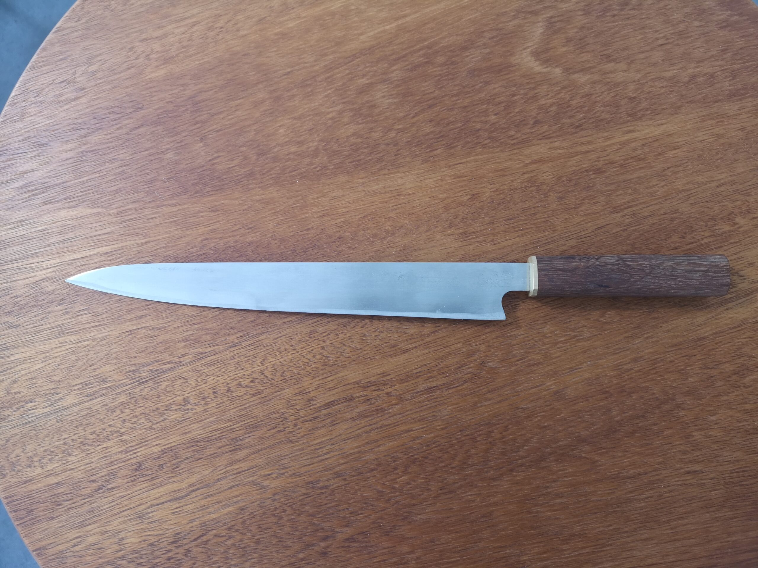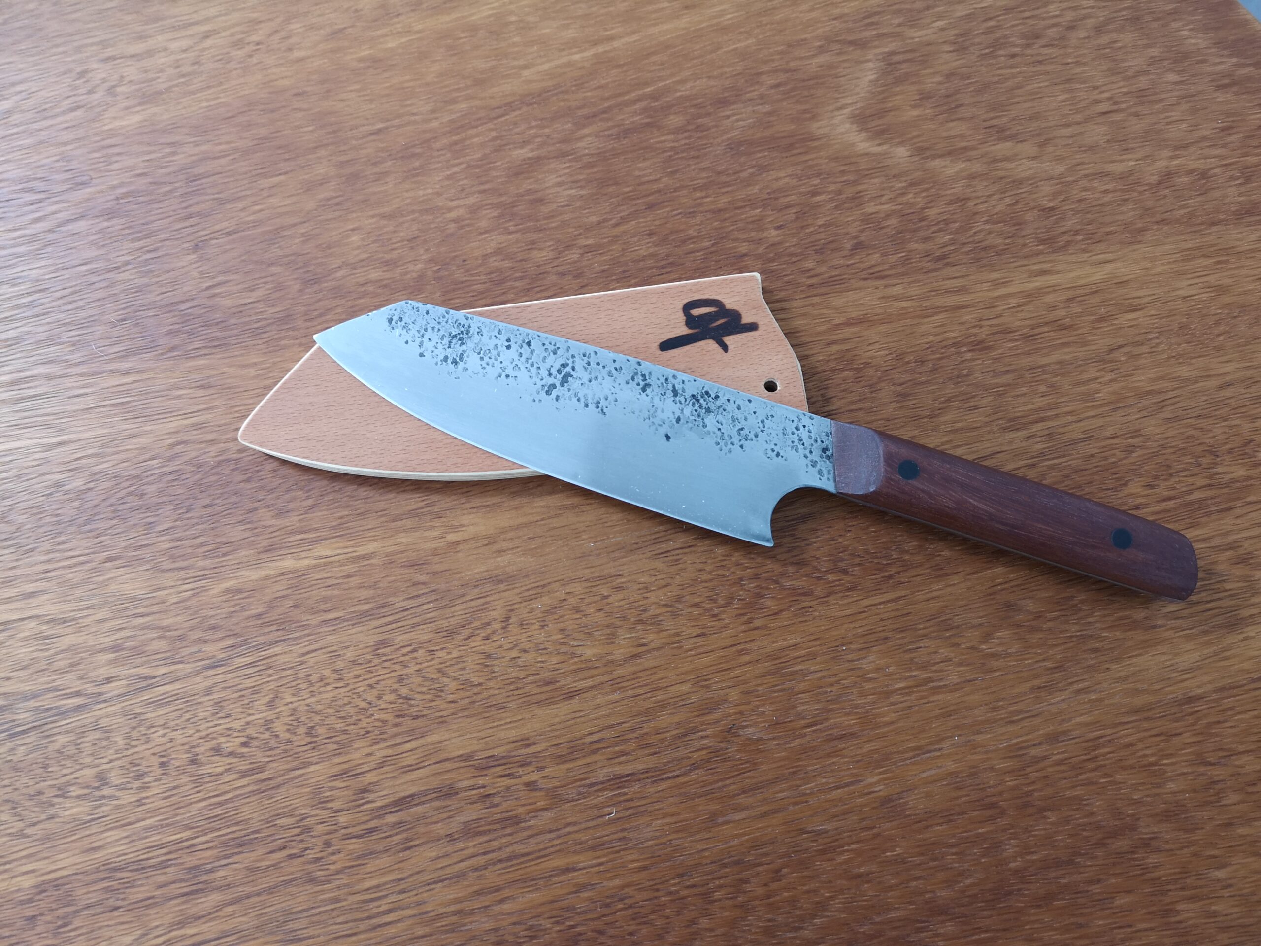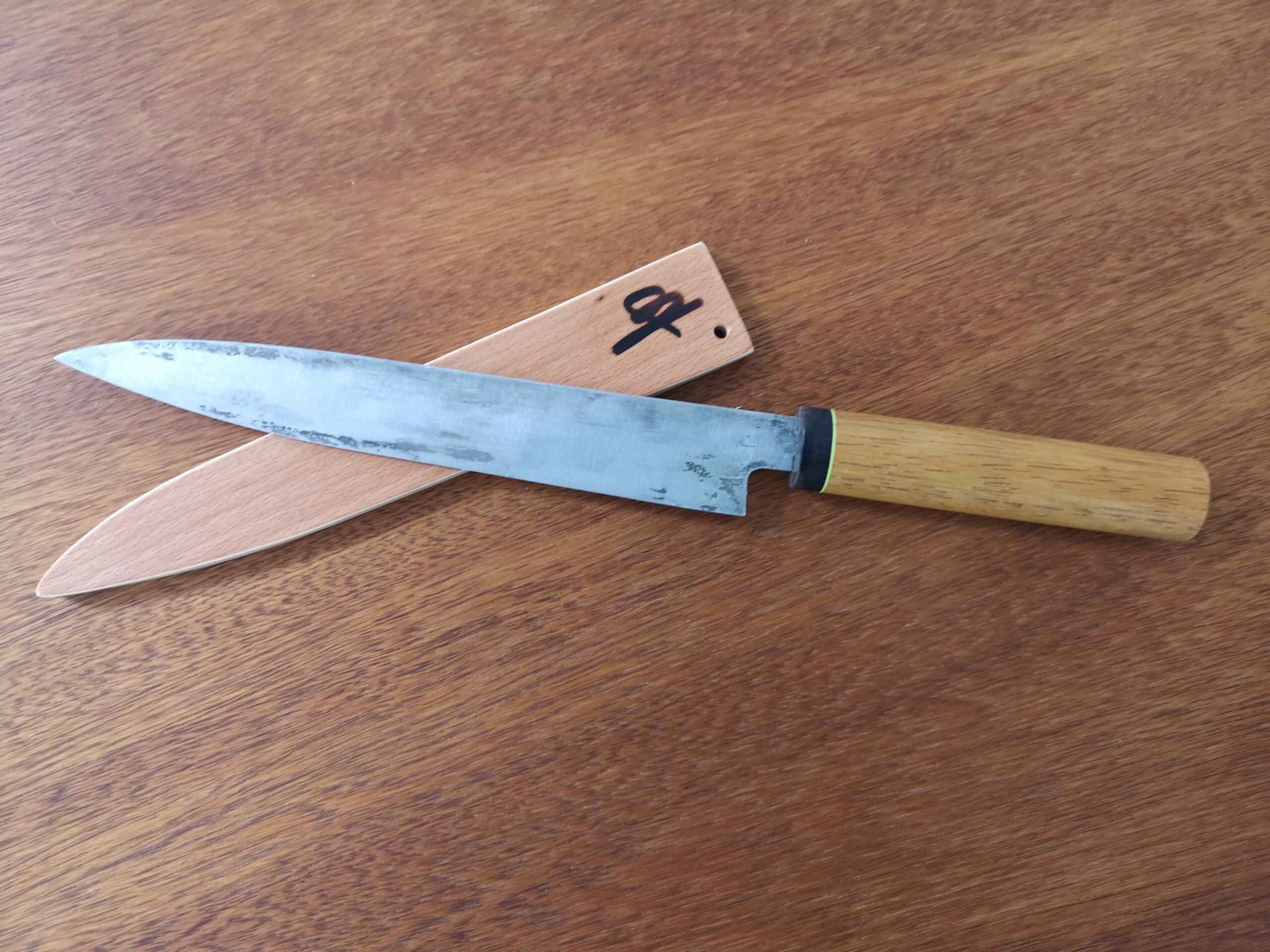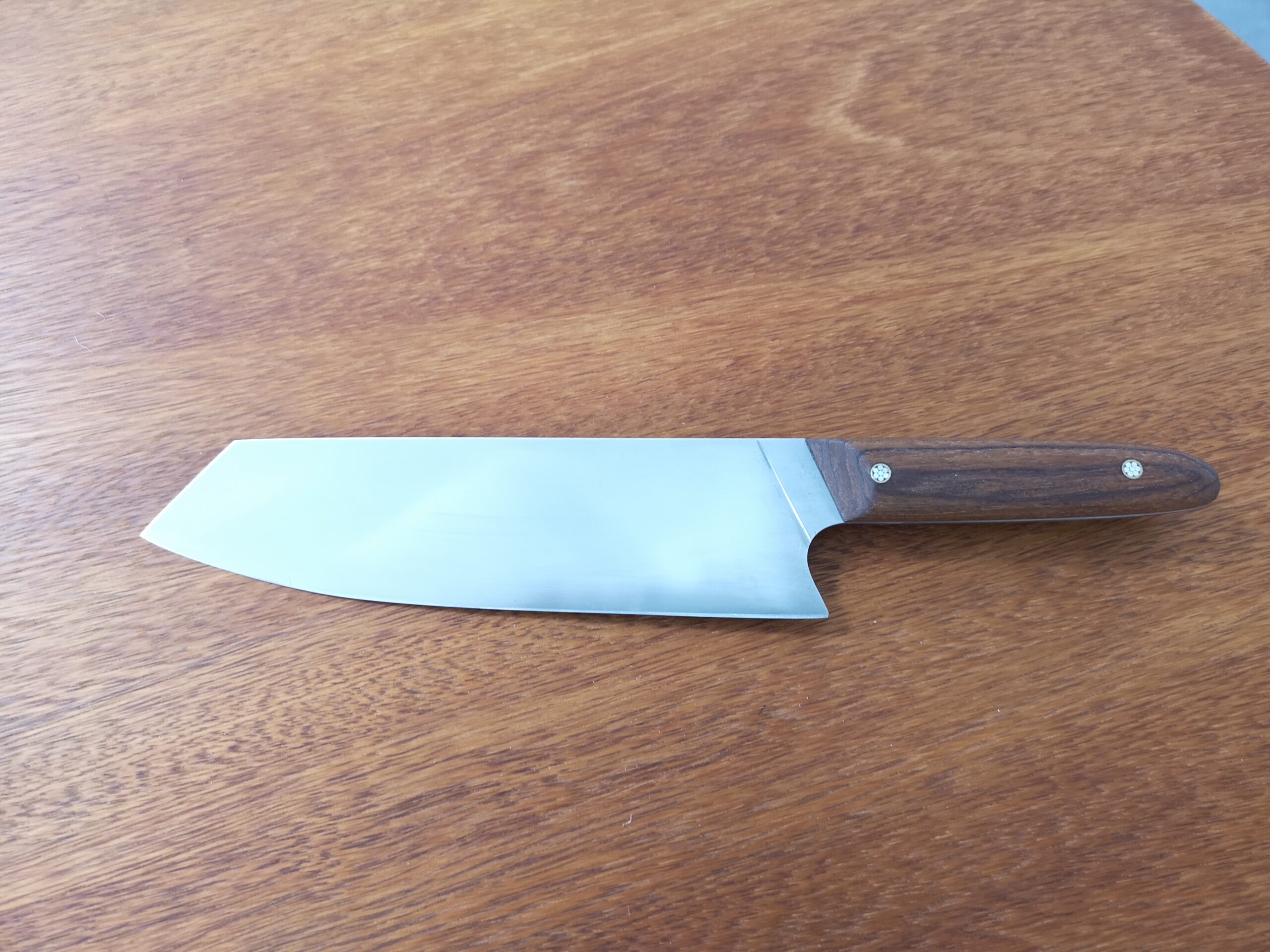 Japanischer San Mai(3 Lagen) mit Shiro2 Mittellage nicht Rostfrei Mittellage sehr hohe Schärfe und Härte plus erhöhte Zähigkeit gegenüber Shirogami(Weißpapierstahl) durch die Nickel Zugabe. Aussenseiten deutlich weicher als die Mittellage. Made in Japan Carbon: 1.0% Chrom: 0.3% Nickel: 1.0% ca.62 HR